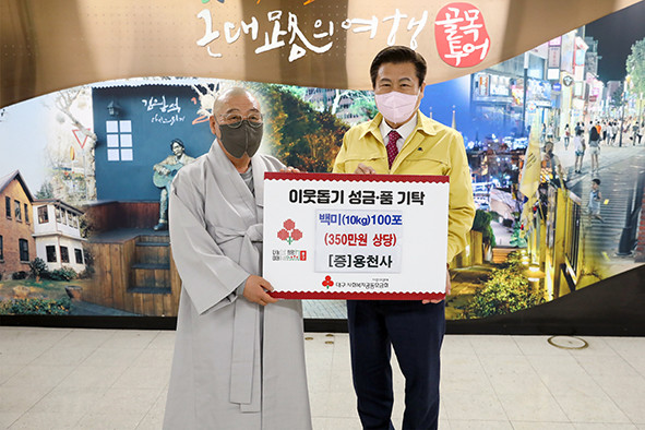 [일요주간 = 이재윤 기자] 지난 5일 대구 중구청에 반가운 손님이 찾아왔다. 중구 남산동에 소재한 용천사 주지 청호스님은 이날 중구청을 찾아 백미 10kg 100포(350만원 상당)를 기탁했다.