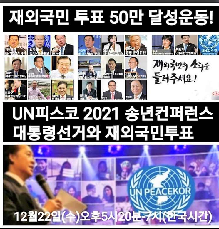 [일요주간 = 정승덕/샌프란시스코 기자] UN한반도평화번영재단(UN피스코, 이사장 김덕룡)이 오는 22일 오후 5시30분 UN피스코 활동보고와 ‘송년 컨퍼런스’(대통령선거와 재외국민투표, 재외국민국민투표50만 달성)를 비대면과 대면으로 함께 개최한다.