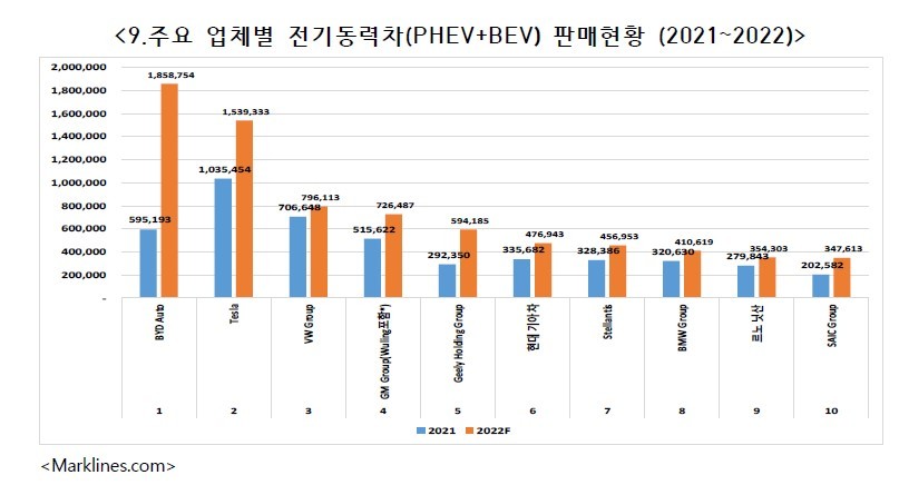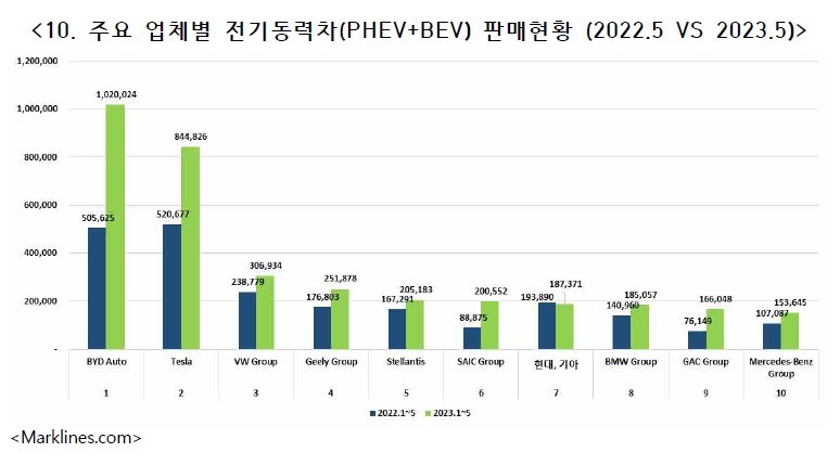 업체별 전기동력차 판매현황을 살펴보면 2022년 1~5월 중국계 브랜드는 10위권 내에 BYD, Geely Group 2개 기업만 순위에 들었으나, 중국 NEV시장의 폭발적인 성장과 함께 수출 및 해외진출 확대로, 10위 권내에 BYD, Geely Group, SAIC Group, GAG Group 4개 기업이 진입했다.