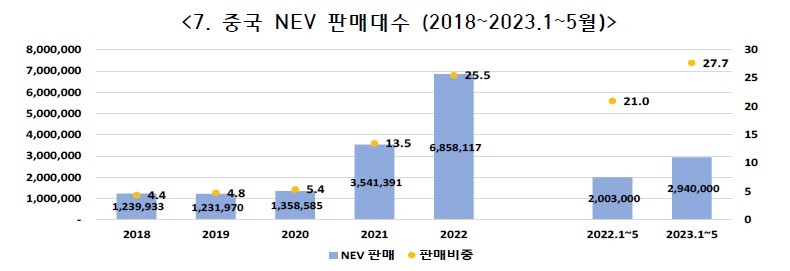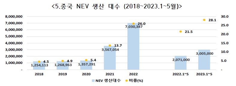 중국의 2023.1~5월 NEV(신에너지차) 생산은 전년대비 45.1%, 판매는 전년대비 46.8%로, 전체 자동차 생산의 28.1%, 판매의 27.7%를 차지했다.