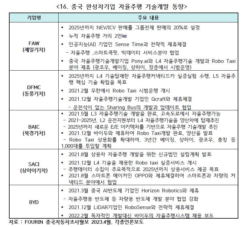 | ▲ 중국 완성차기업 자율주행 기술개발 동향(이미지=한국자동차모빌리티산업협회) |