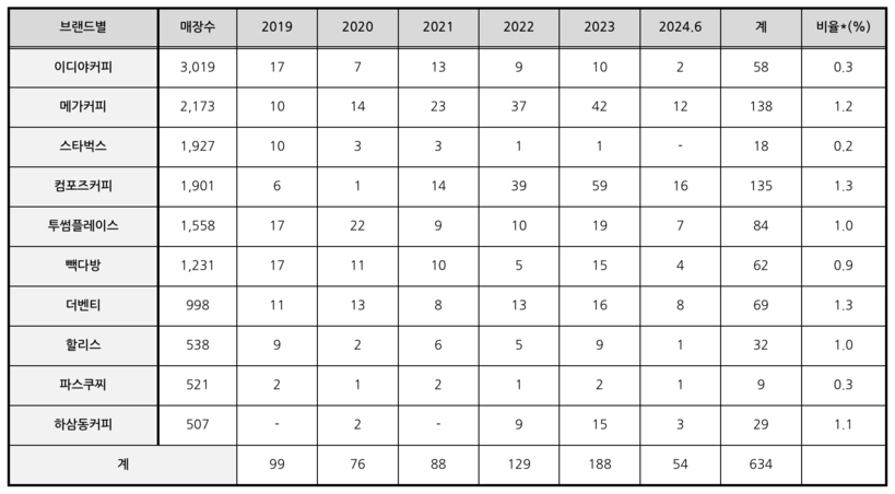 최근 6년 간(2019년~2024년 6월 말 기준) 브랜드별 매장 수 대비 평균 위반건수 비율을 분석한 결과 컴포즈커피·더벤티(1.3%), 메가커피(1.2%), 하삼동커피(1.1%), 투썸플레이스·할리스(1.0%) 순으로 높았으며 스타벅스(0.2%), 이디야커피·파스쿠찌(0.3%) 순으로 낮았다.