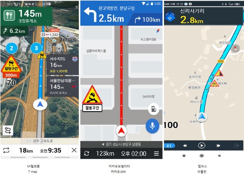 | ▲ SK텔레콤(티맵), 카카오모빌리티(카카오내비), 맵퍼스(아틀란) 등 민간 내비게이션 3개사가 12월 1일부터 내년 2월 29일까지 상습 결빙도로에 대한 음성안내서비스를 시범 실시한다.(사진=행정안전부 제공) |