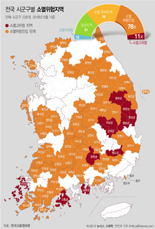 ▲ 한국고용정보원이 전국 시군구 및 읍면동의 지방소멸위험도를 분석한 '한국의 지방소멸 2018' 보고서에 따르면 전국 228개 시군구 중 소멸위험 지역은 2013년 75개(32.9%)에서 2018년 89개(39%)로 증가하여 10곳 중 4곳은 저출산·고령화에 따른 인구감소로 인해 사라질 위험에 처해 있다. |