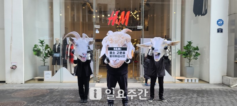 [일요주간 = 김상영 기자] 세계적인 동물보호단체 피타(PETA)는 28일 정오 서울 중구에 위치한 의류기업 에이치엔엠(H&M) 매장(명동점) 앞에서 동물들의 신체 일부분을 절단해 만드는 모헤어와 캐시미어 제품 판매를 하지 않겠다고한 약속을 철외한 H&M을 규탄하는 집회를 진행했다.