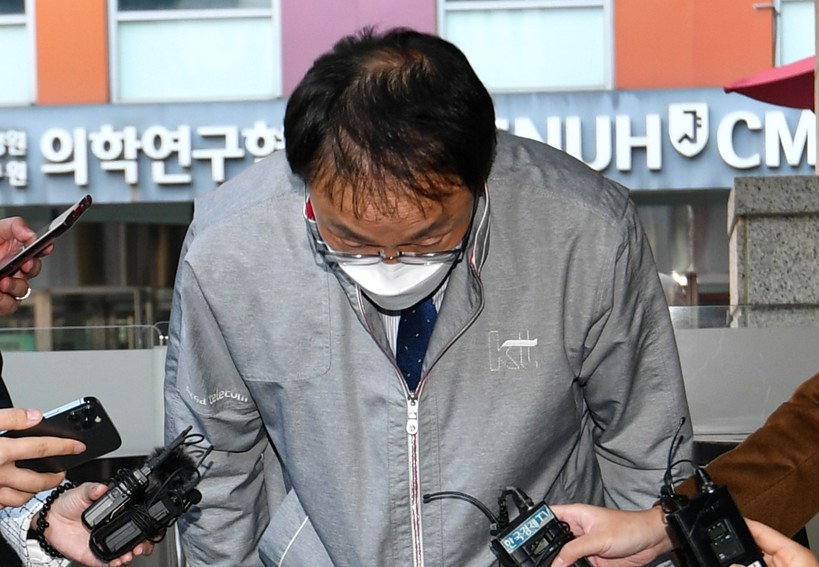 ▲ 구현모 KT 대표가 28일 서울 종로구 KT혜화타워(혜화전화국) 앞에서 지난 25일 발생한 KT의 유·무선 인터넷 장애와 관련해 고개 숙이고 있다. (사진=뉴시스/공동취재사진)