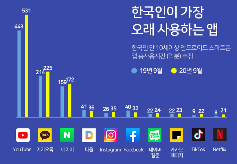 세 번째로 오래 사용한 앱은 '네이버'로, 지난해 9월 159억분에서 올해 9월 172억분으로 사용시간이 8% 확대됐다. 그 뒤를 인스타그램, 페이스북, 네이버 웹툰, 카카오페이지, 틱톡, 넷플릭스 등이 잇고 있으며 당분간 유튜브와 카카오톡, 네이버는 부동의 3위를 지킬 것으로 분석된다.