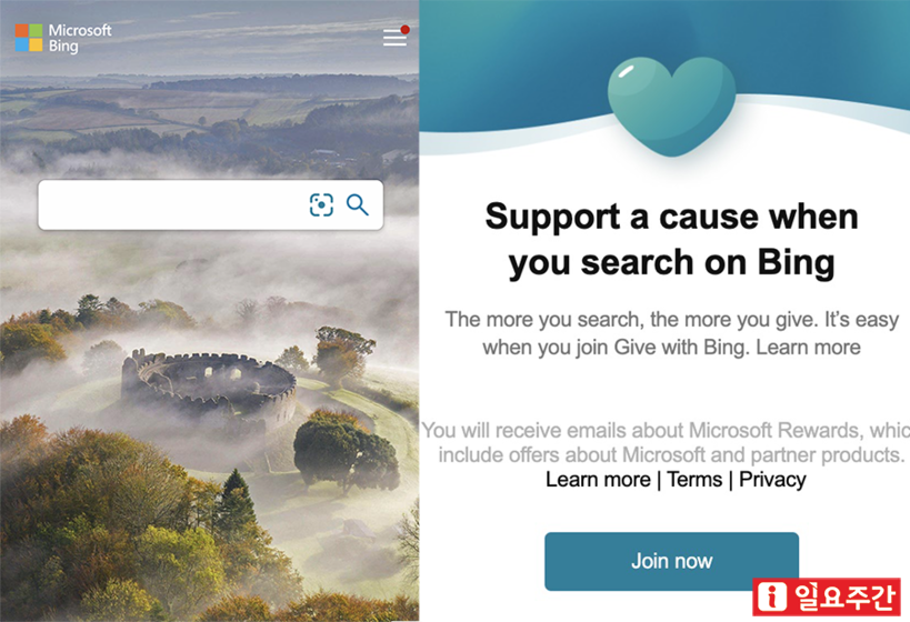 | ▲ 빙 모바일 초기화면 / 7개국에 적용된 검색 포인트 기부 이벤트 안내문 (이미지편집=일요주간) |