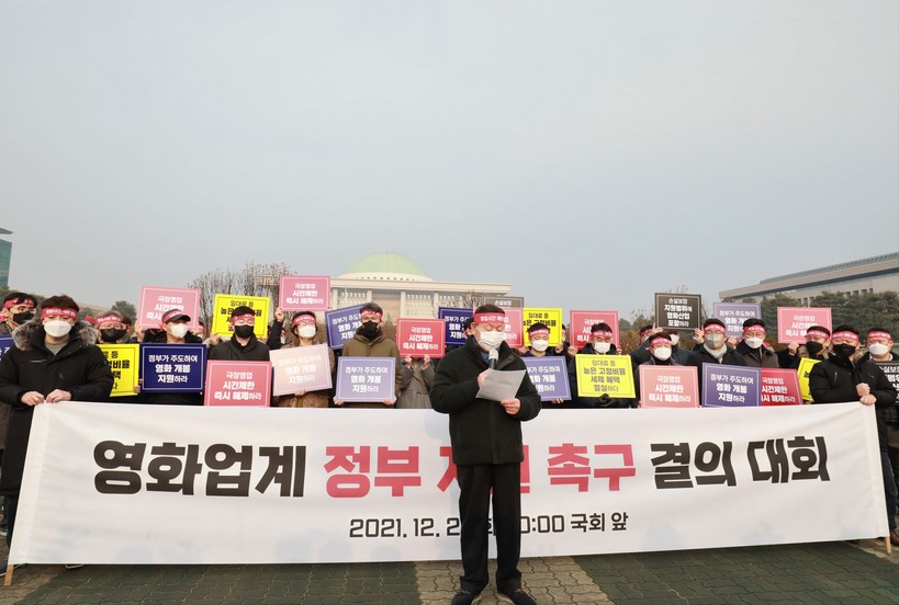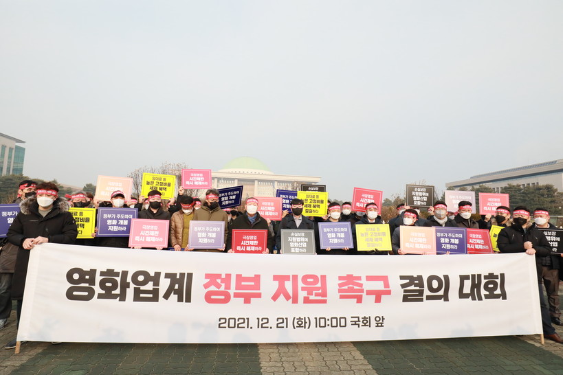 21일 오전 10시 여의도 국회의사당 앞에는 한국상영관협회를 비롯해 각 극장사, 한국영화프로듀서조합, 수입배급사협회 등 영화단체 소속 영화인 50여 명이 모여 ‘영화업계 정부지원 호소 결의 대회’를 개최했다.