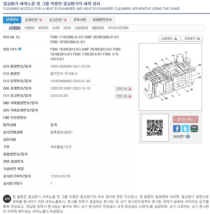 LG전자가 밝힌 특허는 ‘열교환기 세척노즐 및 그를 이용한 열교환기의 세척 장치’로 출원번호는 LG전자의 해명대로 끝자리 숫자가 89인 ‘1020110028389(2011.03.29.)’로 확인됐고 심사 진행 상태는 ‘등록결정’으로 특허청 사이트에 올라와 있는 것으로 취재 결과 확인됐다.