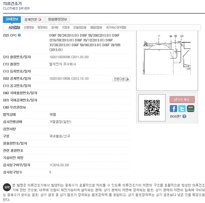 <일요주간>이 특허청 사이트를 통해 확인한 결과 심사 진행 상태가 ‘거절결정’으로 나오는 해당 출원번호는 ‘1020110028398(2011.03.29.)’로 출원인은 ‘LG전자 주식회사’고 해당 발명은 ‘의류건조기에서 발생하는 응축수가 효율적으로 처리될 수 있도록 의류건조기의 저면의 구조를 효율적으로 형성한 의류건조기에 관한 것’이다.