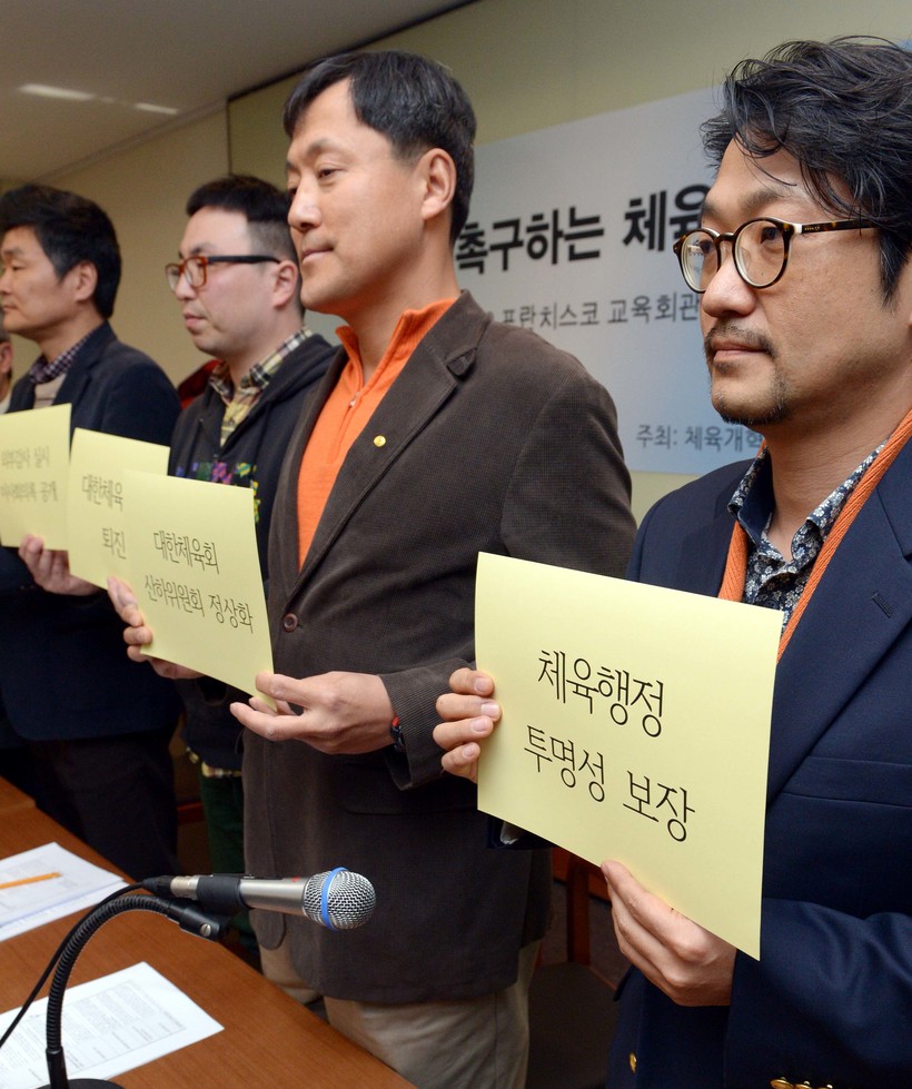 | ▲지난 2014년 서울 중구 프란치스코 교육회관에서 열린 '체육개혁 실천을 촉구하는 체육단체연대(스포츠문화연구소, 체육시민연대, 문화연대 체육문화위원회)' 기자회견에서 참가자들이 피켓을 들고 체육개혁을 촉구하고 있는 모습.(사진=newsis) |