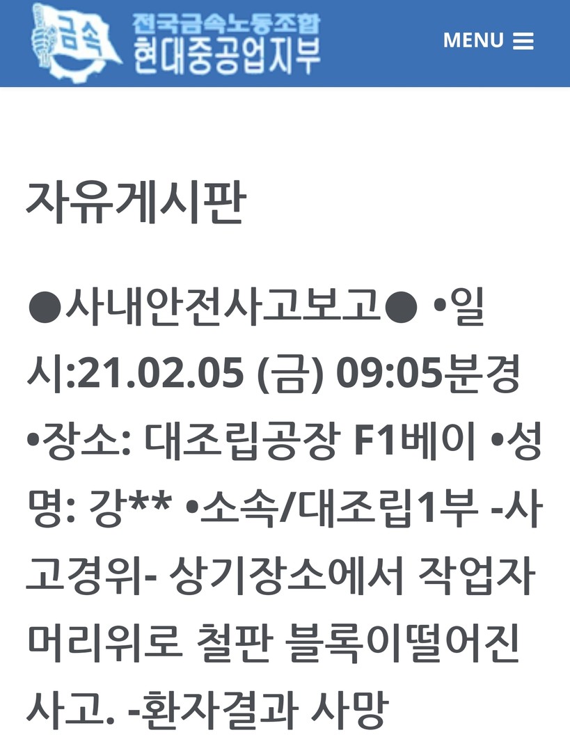한편 현대중공업의 중대재해 사고는 어제오늘의 일이 아니다. 현재중공업은 2015년과 2017년 노동계가 선정한 ‘최악의 살인기업’으로 선정될 정도로 대표적인 산재 다발 사업장으로 악명이 높다.