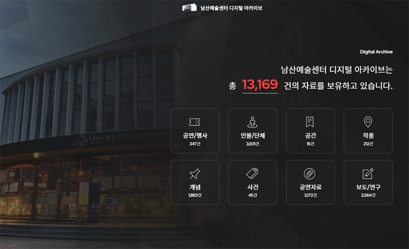 디지털 아카이브는 남산예술센터에서 제작한 공연과 행사 정보와 공연과 행사에 참여한 인물, 단체 정보, 공연과 행사가 수행된 공간 정보 등이 수록되어 있으며, 공연의 기반이 된 희곡이나 소설 등 작품 정보, 장르, 주제, 소재 등 공연을 대표하는 키워드 정보도 포함한다.