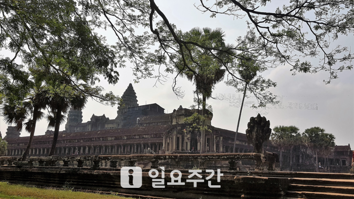 길이 5.4㎞ 성벽과 폭 190m의 해자로 둘러싸인 사원 내부로 들어가면 본전 높이가 65m나 되는 중앙사당을 중심으로 5개의 원뿔형 탑이 펼쳐진다. 앙코르 유적 대부분은 해자와 성벽으로 둘러싸여 있는데, 이는 신들의 세계를 재현하기 위한 요소다. 해자는 바다를, 성벽은 신성한 산맥을 상징하며 신과 인간 세계를 명확하게 구분 짓는다.
