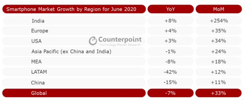 | ▲ 2020년 6월 지역별 스마트폰 시장 전년 동기 및 전월 대비 증감율 (출처=카운터포인트리서치) |