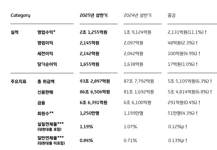 올해 상반기 개인 및 법인을 합한 신용판매 규모는 전년 동기 대비 5조 4814억 원(6.8%) 증가해 업계 최고 수준의 취급액을 기록했다. 같은 기간 회원 수는 51만 명(4.3%) 순증하며 카드사 중 가장 높은 증가세를 나타냈다.