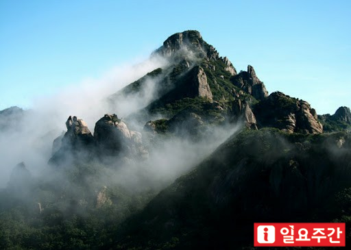 ▲ 운무에 싸인 신령스러운 월출산 천황봉. 陰의 이름을 가진 월출산이지만, 산 정상은 불꽃모양인 陽의 모습이다 |