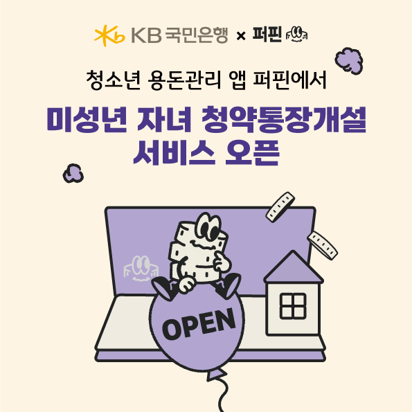 [일요주간 = 김완재 기자] KB국민은행(은행장 이환주)이 청소년 용돈관리 앱 ‘퍼핀’을 운영하는 ㈜레몬트리와 협력해 미성년 자녀 명의 주택청약종합저축 비대면 개설 서비스를 출시하며 금융 편의성과 청소년 금융 교육 강화에 나섰다.