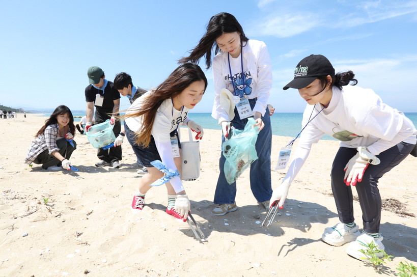 ▲ LG생활건강이 지난달 29일 청년 기후환경활동가 100여 명과 함께 강원 강릉시 주문진 바닷가에서 해양 쓰레기를 수거하는 비치코밍 활동을 했다. (사진=LG생활건강 제공) |