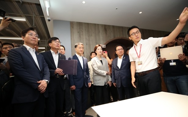 ▲ 정부부처 장관 등 관계자들이 20일 서울 종로구 센트로폴리스 내 SKT 5G 스마트오피스를 방문해 관계자로부터 사무환경 관련 AR(증강현실) 설명을 듣고 있는 모습.(사진=newsis) |