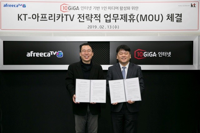 KT는 13일 서울 잠실 아프리카TV 오픈스튜디오 'KT 10GiGA Arena'에서 아프리카TV와 전략적 제휴 협약(MOU)를 체결했다고 밝혔다.