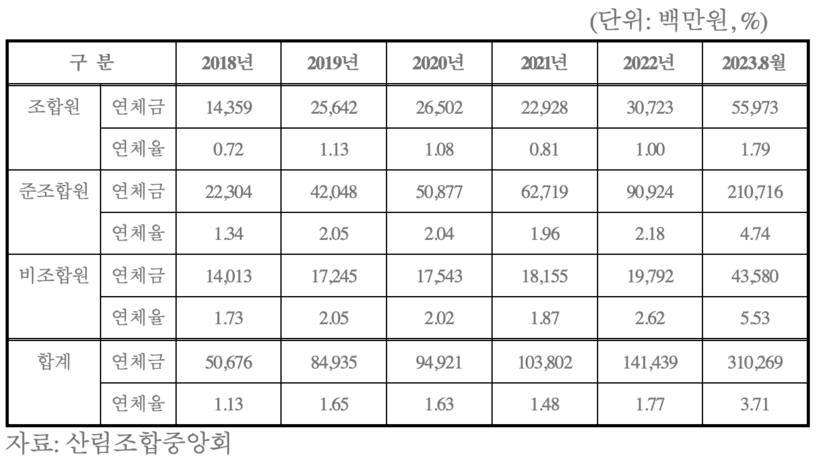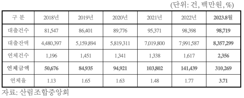 국회 농림축산식품해양수산위원회 소속 국민의힘 정희용 의원이 산림조합중앙회)로부터 제출받은 ‘최근 5년여 간(2018~2023.8월) 대출 및 연체 건수, 연체금 현황’을 분석한 결과 대출 건수는 2018년 8만 1547건에서 올해 8월 기준 9만 8719건으로 21.1% 증가했지만 같은 기간 연체금은 2018년 506억 7600만 원에서 올해 8월 3102억 원 6900만 원으로 무려 6배(512.3%) 급증한 것으로 나타났다.