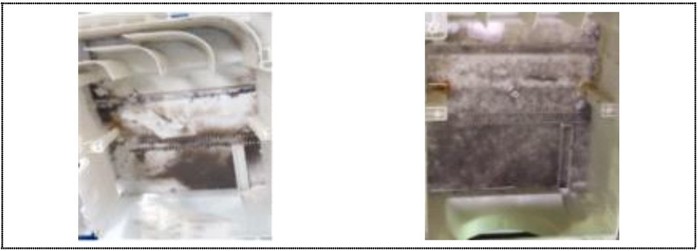 | ▲ 세척에 활용된 잔류 응축수가 콘덴서 하단에 고여 곰팡이 등 발생 가능.(제공=한국소비자원) |