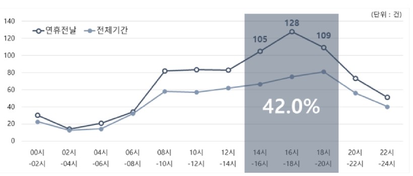 시간대별로는 오후 시간대(14시~20시) 연휴 전날 교통사고의 42%가 집중됐고, 특히 오후 4시~6시 사이에 가장 사고가 많았다.