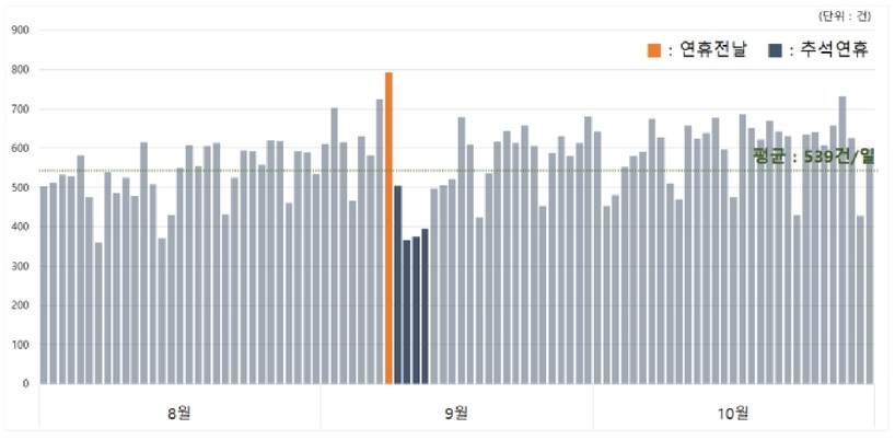 최근 5년 연휴 전날 교통사고는 일평균 813건으로 연간 일평균(579건)보다 1.4배 많았으며, 특히 2021년, 2022년은 연휴 전날 교통사고가 연중 최고에 달했다.