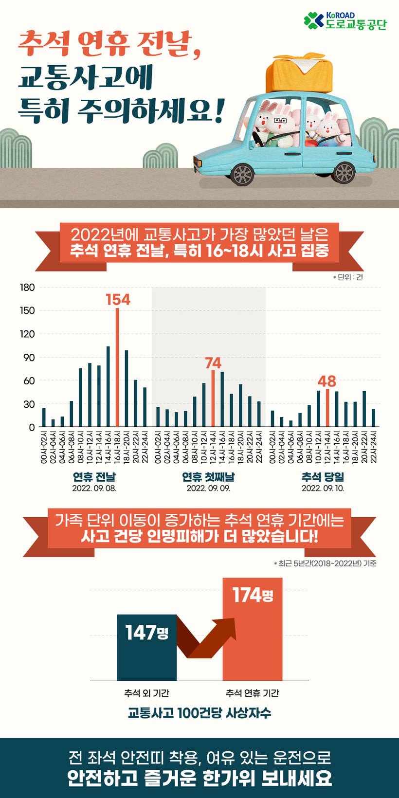 [일요주갸=김영란 기자] 도로교통공단(이사장 이주민)은 최근 5년간(2018~2022년) 추석 연휴 교통사고 빅데이터를 분석한 결과, 연휴 전날의 교통사고가 가장 많은 것으로 나타났다고 밝히며, 9월 27일(수) 귀성길 안전운전을 당부했다.