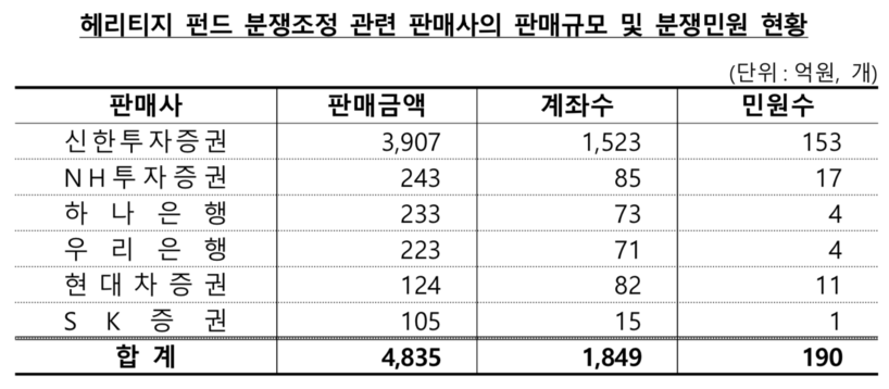 한편 9월 말 기준 헤리티지 펀드 관련 분쟁조정 신청 건수는 6개사에 190건이다. 이중 신한투자증권이 153건으로 가장 많고 다음으로 NH투자증권이 17건, 현대차증권 11건, 하나은행 4건, 우리은행 4건, SK증권 1건으로 집계됐다.