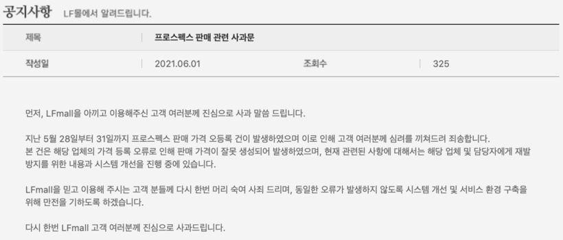 LF는 1일 홈페이지 공지사항에 게재한 '프로스펙스 판매 관련 사과문'을 통해 "지난 5월 28일부터 31일까지 프로스펙스 판매 가격 오등록 건이 발생했으며 이로 인해 고객 여러분께 심려를 끼쳐드려 죄송하다"며 "본 건은 해당 업체의 가격 등록 오류로 인해 판매 가격이 잘못 생성되어 발생했으며 현재 관련된 사항에 대해서는 해당 업체 및 담당자에게 재발 방지를 위한 내용과 시스템 개선을 진행 중에 있다"고 밝혔다.