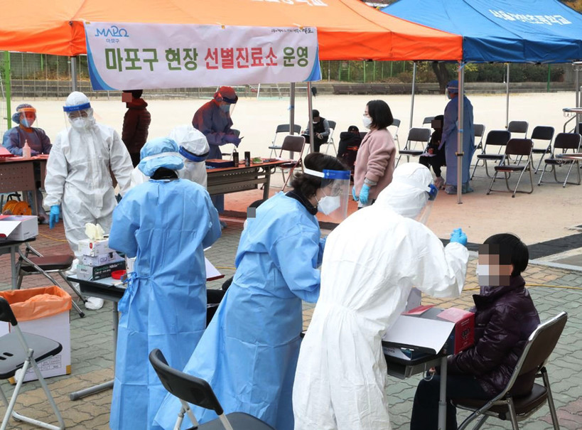 ▲17일 오후 서울 마포구 창천초등학교에 신종 코로나바이러스 감염증(코로나19) 선별진료소가 설치되었고 학생 및 교직원 등 전수검사 실시 (이미지=뉴시스)