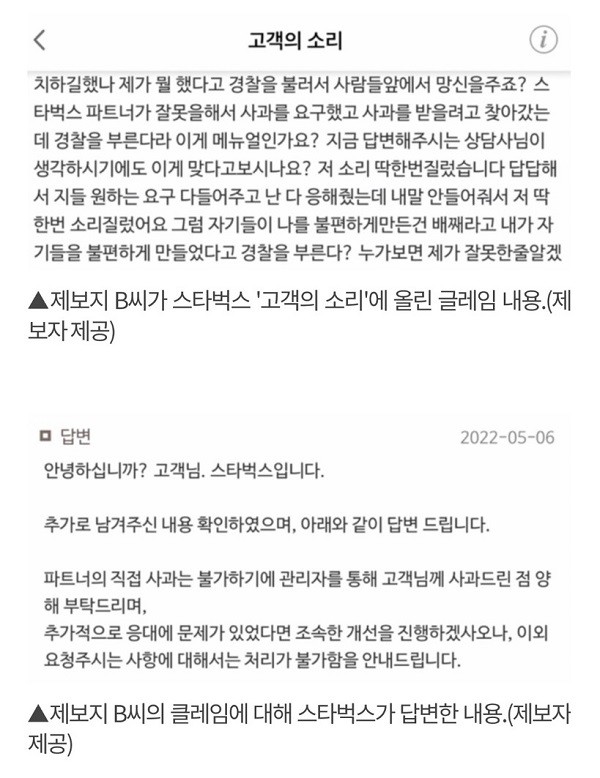 ▲ 지난 5월 6일자 본지 보도(온라인 기사 제목 : 스타벅스에 클레임 걸면 경찰 신고가 메뉴얼?…고객 “수모 겪고 정신과 치료”) 관련 스타벅스 고객 A 씨 제보 내용 갈무리. |