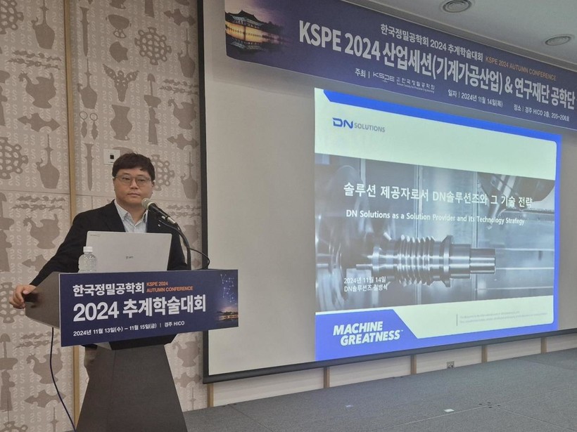 ▲ DN솔루션즈 길병식 팀장이 지난 14일 경북 경주시 경주화백컨벤션센터에서 열린 한국정밀공학회 '2024 추계학술대회' 산업 세션에서 '솔루션 제공자로서 DN솔루션즈와 그 기술 전략'을 주제로 발표하고 있다. (사진=DN솔루션즈 제공) |