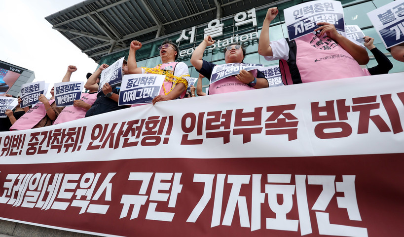 ▲ 공공운수노조 전국철도노조 코레일네트웍스지부와 철도고객센터지부 등이 지난해 7월 16일 오전 서울 용산구 서울역 앞에서 코레일네트웍스의 근로기준법 준수 등을 촉구하는 기자회견을 하고 있다. (사진=newsis)