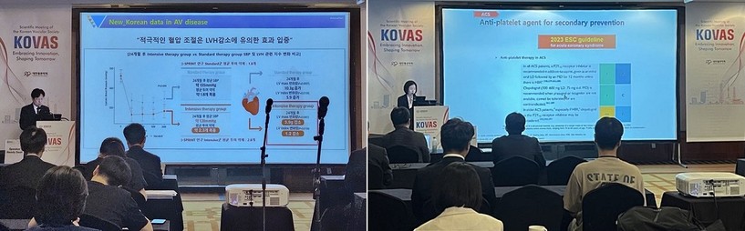 ▲ 7월 12일, 13일 KOVAS2024 산학 세션에서 신정훈 교수(좌)와 김현진 교수가 발표를 진행하고 있다. (사진=한미약품 제공) |