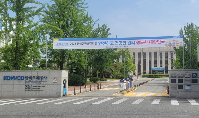 | ▲ ‘2023산업안전보건의 달’을 맞이하여 한국조폐공사 본사(대전시 유성구 소재) 입구에 현수막이 걸려있다.(사진=조폐공사) |
