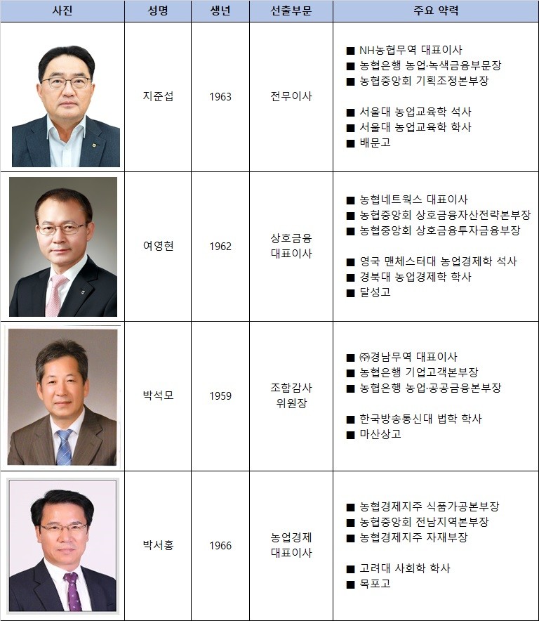 [일요주간 = 김완재 기자] 농협중앙회(회장 강호동)는 21일 지준섭 전무이사를 비롯해 여영현 상호금융대표이사, 박석모 조합감사위원장을, 농협경제지주는 박서홍 농업경제대표이사를 선임했다.