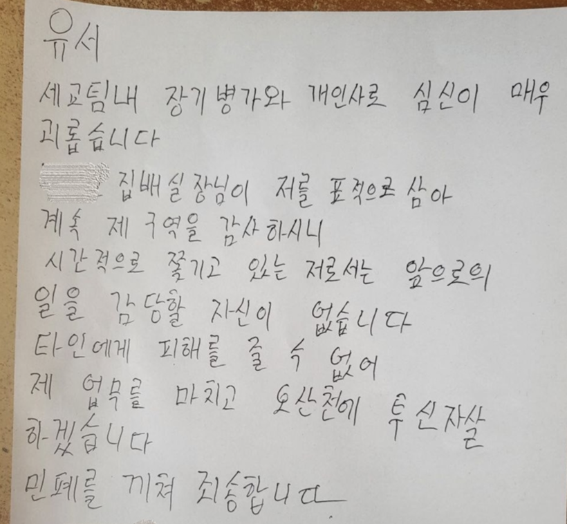 ▲ 피해자 A 씨가 작성한 유서. (사진=전국민주우체국본부 제공)