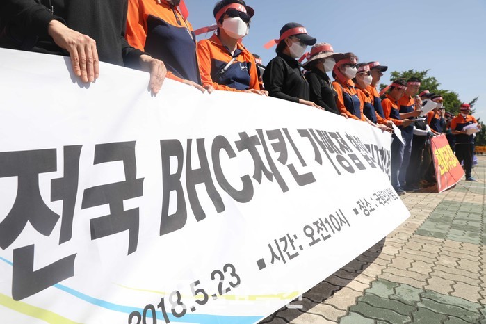 ▲ 지난해 5월 서울 여의도 국회 앞에 모인 전국BHC치킨 가맹점 협의회원들. |
