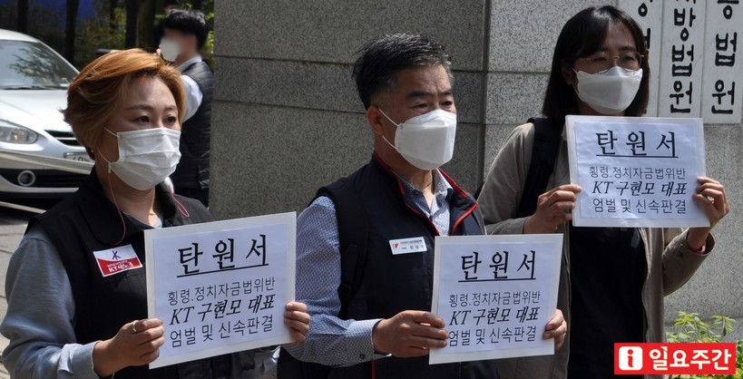 28일 서울 서초구 중앙지방법원 앞에서 KT새노조, 민주노총, 참여연대 등 시민사회단체는 기자회견을 열고 횡령 및 정치자금법 위반으로 재판 중인 구현모 KT 대표에 대한 사법부의 엄중 처벌을 촉구했다. 이들은 구현모 KT 대표가 올해 1월 횡령 및 정치자금법 위반 혐의 등으로 벌금형을 받은 것에 불복하고 정식 재판을 청구한 것에 대해 ‘연임을 위한 시간 끌기’라고 판단, 신속 판결을 재판부에 주문했다.