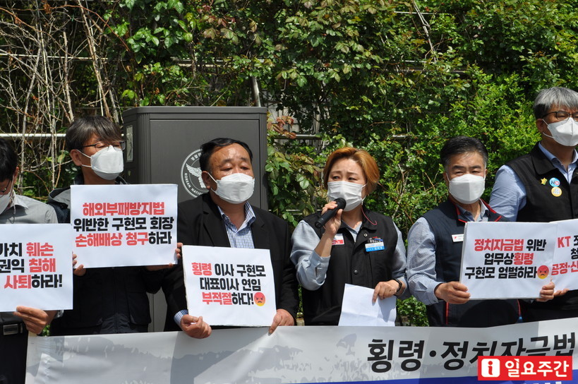 이날 김미영 KT새노조 위원장은 재판 과정에서 구현모 KT 대표이사가 ‘상품권 등으로 국회의원에 후원하는 행위가 불법인지 몰랐다’라는 취지로 답한 것을 언급하며 “구 대표의 발언은 국민기업을 자처하는 KT의 대표이사로서 매우 부적절하다. 또한 진정 몰랐더라면 무능한 것”이라고 지적했다.