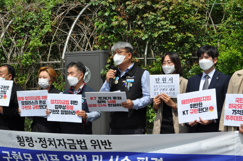 ▲28일 서울 서초구 중앙지방법원 앞에서 노동계, 시민사회단체 등이 횡령 및 정치자금법 위반 혐의를 받고 있는 KT 구현모 대표에 대해 엄벌 및 신속 판결을 촉구하는 기자회견을 개최했다. <사진=성지온 기자>