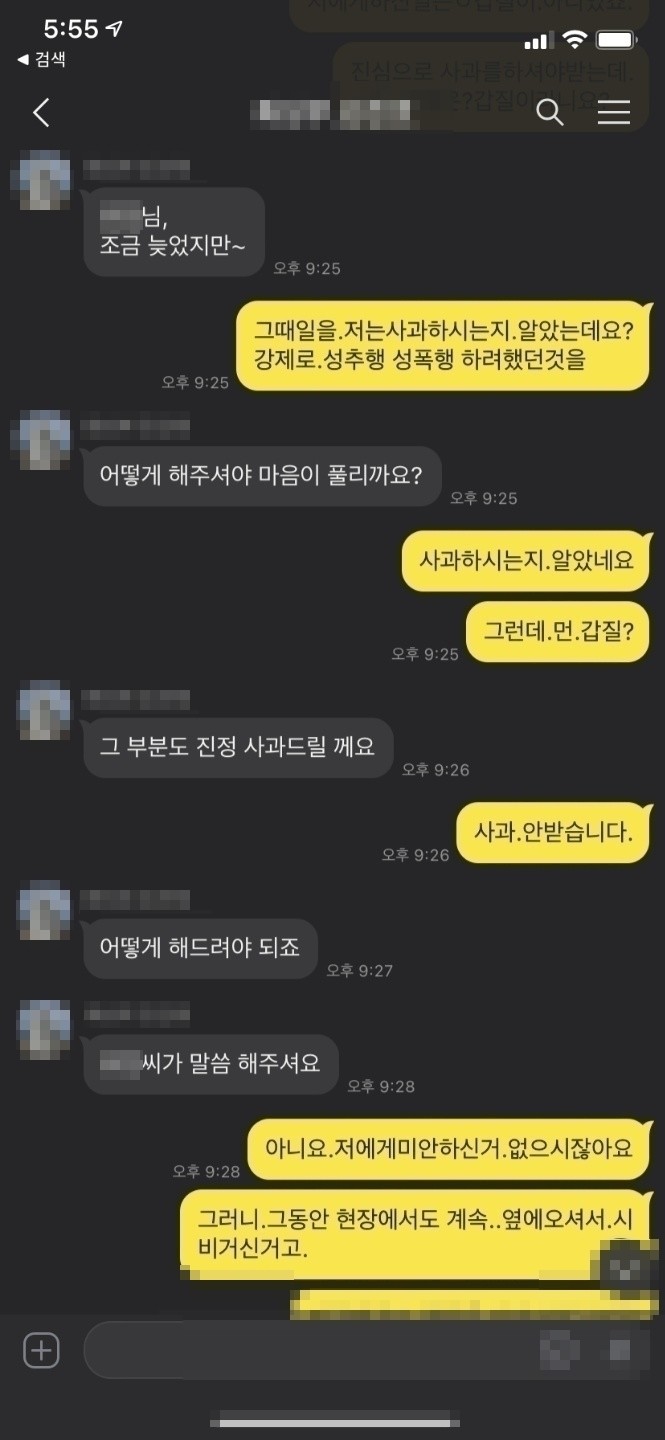 ▲포스코 광양제철소 소속 간부 A 씨가 협력업체 여직원 B 씨에게 성폭행과 관련해 합의를 종용하는 카톡 메시지 내용.(제보자 제공)
