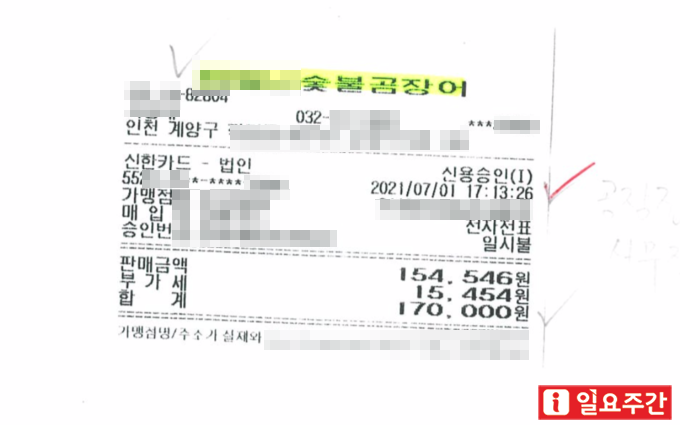▲제보자 A씨가 집행관을 접대한 사실을 증명하는 영수증.(제보자 제공) |