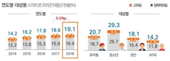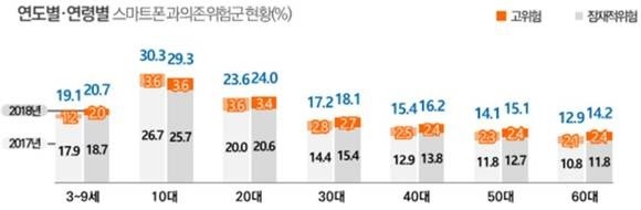 2017~2018년 60대 스마트폰 과의존 위험군은 12.9%에서 14.2%로 1.3%포인트 증가했고, 그동안 가장 관심이 집중됐던 청소년은 30.3%에서 29.3%로 1.0%포인트 감소했다.