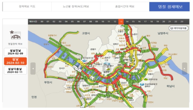 ‘명절 정체예보’ 대상은 ▲자동차전용도로 8개(강변북로, 올림픽대로, 내부순환로, 동부간선도로, 북부간선도로, 분당수서로, 강남순환로, 경부고속도로) ▲한강교량 20개(행주대교, 가양대교, 월드컵대교, 성산대교, 양화대교, 서강대교, 마포대교, 원효대교, 한강대교, 동작대교, 반포대교, 한남대교, 동호대교, 성수대교, 영동대교, 잠실대교, 잠실철교, 올림픽대교, 천호대교, 광진교) ▲주요 간선도로 12개(강남대로, 반포대로, 동작대로, 화랑로, 동일로, 서빙고로, 뚝섬로, 국회대로, 서부간선도로(지상), 안양천로, 남부순환로, 노들로)이다.