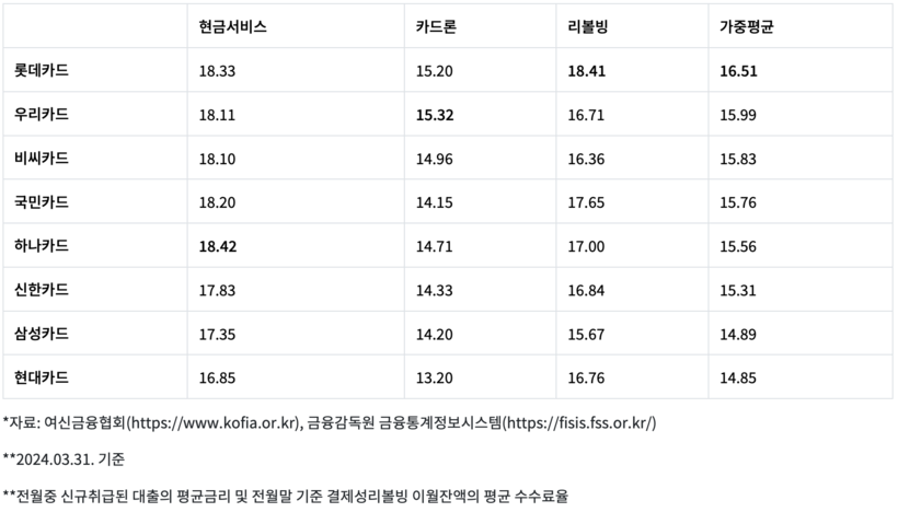 해당 조사 결과 카드사의 신용카드 서비스 금리 현황에서 올해 3월 31일 기준 롯데카드의 신용카드 서비스 금리가 가장 높은 것으로 나타났다.